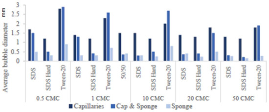 Figure 6 shows that introduction of a soft porous media into the capillary system or as the foaming substrate decreases the average bubble diameter. For instance, the average bubble diameter diluted with hard water at a concentration of 50 CMC has a bubble diameter of 1.2 mm with capillaries. In contrast, with a sponge in the capillary system, this drops to 0.21 mm, and when forming foam with the dishwasher sponge instead of capillaries, this drops to 0.15 mm. The bubbles were more homogenous when using capillaries but became more heterogeneous with a wide range of bubble sizes when using a sponge, as shown in Figure 7.