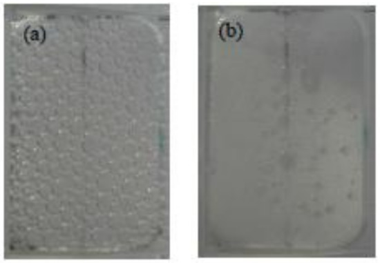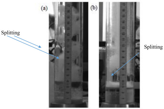 Examples of splitting caused by coalescing at (a) 1 CMC SDS diluted with distilled water with capillaries and sponge and (b) 10 CMC SDS diluted with distilled water with capillaries. The splitting is indicated by the arrow showing the points where the foam has separated.