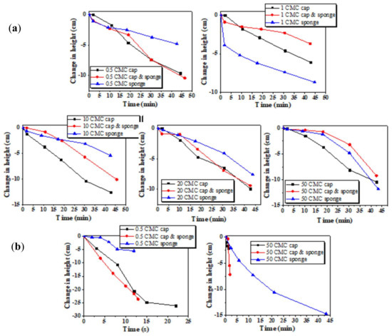 Rate of foam drainage on capillaries (cap), capillaries, and dishwasher sponge system and foam formed by dishwasher sponge. (a) SDS solutions with hard water at all five concentrations and (b) Tween-20 solutions at 0.5 and 50 CMC.