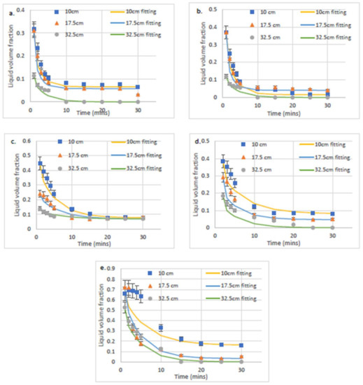 Dependency of liquid volume fraction with time of foam at each height for SDS solutions diluted with distilled water with concentrations (a) 0.5 CMC, (b) 1 CMC, (c) 10 CMC, (d) 20 CMC, and (e) 50 CMC. The fitting is according to Equation (3).
