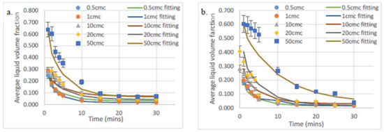 Average liquid volume fraction for whole foam against time for each concentration of SDS, where (a) is distilled water solutions and (b) is 15 dH hard water solutions. The fitting is according to Equation (3).