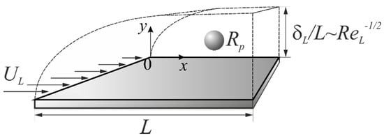 A neutrally buoyant solid sphere of radius Rp, is situated in a BL at a solid plate of length L. The model situation is sketched in Figure 1. The characteristic thickness of the BL region at the plate is , where is the Reynolds number and UL and ν are the flow velocity and the kinematic viscosity of the fluid, respectively [11] (p. 126). The sphere perturbs the outer BL flow at the plate due to its finite dimensions Rp. The basic parameter ratios that characterize the perturbation flow field are δL/L << 1, Rp/L<<1, and Rp/δ < [12,13,14,15]. There geometric interrelations allow to perform a scaling analysis for the governing Navier–Stokes equations [16,17] of the disturbance flow field, so that a system of asymptotic hydrodynamic equations is obtained, which can be solved analytically. Then, the overall force acting on the solid sphere is calculated. Finally, the particle trajectories within the BL are obtained.