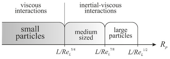 As shown in [12,13], the main result of this asymptotic analysis is that the neutrally buoyant particles are subjected to a granulometric separation inside the hydrodynamic BL at a plate as shown in Figure 2. The criterion for this classification is based on the ration of the parameters of the external flow field and particle’s dimension. Thus, interactions for the small particles with the external flow are predominantly viscous, for the medium-sized , of mixed inertial-viscous type, and for the large species , of inertial type.