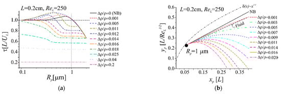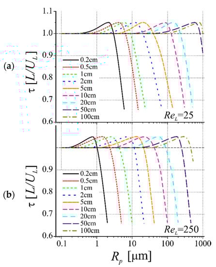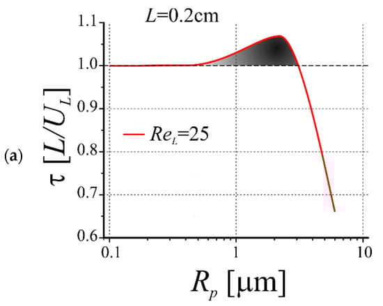 The typical residence times as a function of particle’s dimensions τ(Rp) are shown in Figure 10. As taken from Table 2, the value of L is 0.2 cm, ReL = 250, and Δρ/ρ < 0.23, because in this case, a significant effect of the coupling is to be expected. As is shown in Figure 10a, upon increase in the relative density of the particle up to Δρ/ρ~0.007, the residence time of the particles increases and the maximum values are shifted to smaller species. The residence time sharply decreases for larger entities (Rp ≥ 1 mm and Δρ/ρ~0.009–0.011). At higher density values (Δρ/ρ~0.016), the entrapment of the small particles in the BL region is diminished and the particles are expulsed out of the BL. This tendency is preserved for further increase in Δρ/ρ, and at Δρ/ρ~0.04, the residence time does not depend on Rp.
