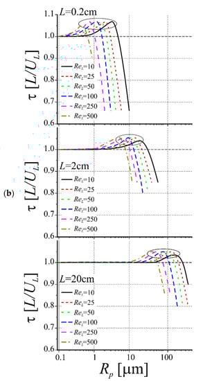 Residence times of the particles against the radii τ (Rp) for various L values: (a) for ReL = 25 and (b) for ReL = 250.