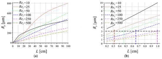 In conformity of this notion are also the data summarized in Figure 6a. Figure 6a presents the interrelation of particles sizes that have maximum residence times inside the BL flow (the values are taken from the maxima in the spectral curves τ (Rp) in Figure 4a,b) against the plate lengths Rp(L) for various ReL. The key result denotes that the most effective BLs are those at ReL = 25, while the least effective, in view of particle capture efficiency, are the BLs with ReL = 500. The detailed data particularly for the finest species and smaller plates, are demonstrated in Figure 6b. This presentation allows to predict, say, the optimal dimensions of the plate at which the hydrodynamic BL is formed. For example, the idea about the conditions for possible granulometric separation of neutrally buoyant sphere of a given radius (Rp = 3 μm) may be extracted in the following manner: The intersections of the horizontal line Rp = 3 μm with each of the various Rp(L)-curves denote the respective lengths of the plates (L) that are expected to ensure the maximum capture effect for this size of the fine solid. Thus, if the Reynolds number of the background flow at the plate is ReL = 25, the optimum length of the plate is L ~ 0.3 cm, while if ReL = 100, the optimum length is L ~ 0.6 cm.