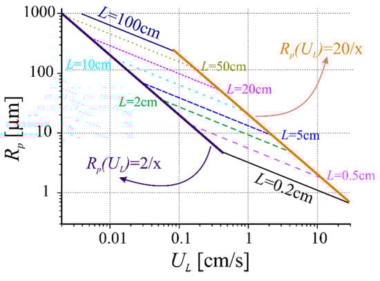 The general presentation of the obtained numerical results, in a form suitable for predictive aims about the design of separation experiments with neutrally buoyant fine entities, is shown in Figure 7 as Rp(UL).