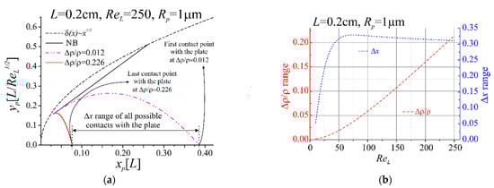 The calculations are performed for L = 0.2 cm and ReL = 250. A particle with Rp = 1 μm is taken for an example, because, as is already shown in Figure 10a,b, it is for these outer flow conditions and such radius of the particle that the residence time τ can have the highest value, if the particle is neutrally buoyant. Thus, the choice of the particle dimension is subjected to the condition that it is both small (according to the classification in Figure 2) and light (Figure 8). As is to be seen in Figure 11a, the neutrally buoyant particle (Δρ/ρ = 0.0) is retarded inside BL, but it is finally expelled out of the BL region. For nonzero relative densities (Δρ/ρ = 0.012 and Δρ/ρ = 0.226), however, it is captured at the wall. Besides, as is to be expected, the higher the density, the shorter is the region on the plate surface, where the particle is entrapped (the so-called “particle entrapment portion of the plate”). Figure 11b represents the interrelation of the range of the particle entrapment portion of the plate and the intensity of the BL flow represented by the Reynolds number ReL: the higher the relative density is, the higher ReL values are at which the fine solids can be captured by the wall. However, these phenomena have their limits and the maximum value for the particle entrapment portion at these particular length scales is at ReL~75. The area between the run of the curves Δρ/ρ(ReL) and Δx(ReL) might be applied for predictive design of separation and selective entrapment of fine species from polydisperse systems in view of various practical implementations and industrial applications.