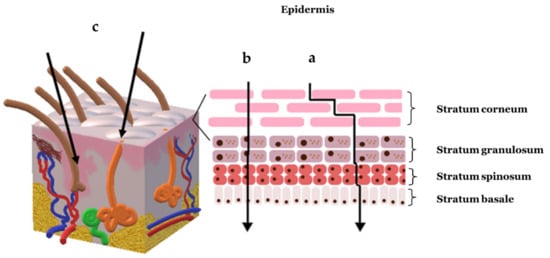 For certain molecules, the passage by these pathways is extremely slow, which makes it challenging to attain an effective level of an active substance in the deeper skin layers or deliver substantial amounts into the bloodstream [18]. In addition, the existence of an excessive skin metabolism has been reported, and, although it is considered to be less significant than the hepatic first-pass effect, it may cause some degradation of an active substance [19,20].