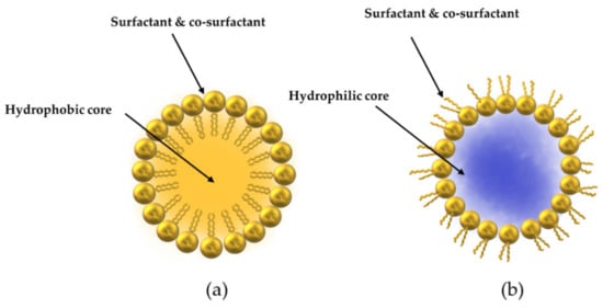 Schematic illustration of (a) O/W microemulsion system, (b) W/O microemulsion system.
