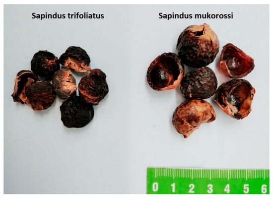 We used well dried commercially available fruit pericarp of Sapindus mukorossi and Sapindus trifoliatus (Bio Company Pulst J.M, Siemianowice Śl., Poland) (Figure 1).