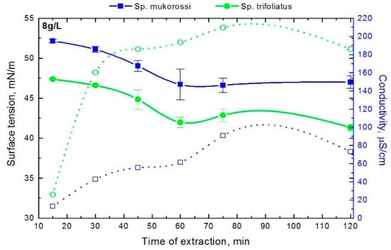 In the next step, the impact of the extraction time on the surface tension changes of solutions prepared with 8 g/L reetha in deionized water were checked. As can be seen in Figure 3 the surface tension values decreased with increasing extraction time up to 1 h. Further prolongation of the extraction time did not significantly change the γ value. The obtained surface tension changes correlate with changes in the conductivity.