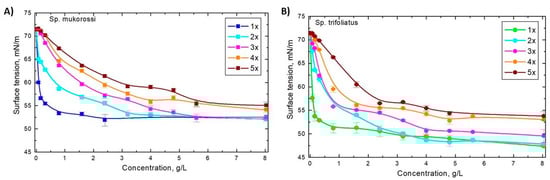 Surface tension of aqueous solutions of: (A) Sp. Mukorossi and (B) Sp. trifoliatus after repetitive 15 min extraction of the same pericarps at 25 °C.