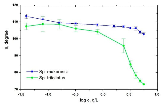 Wetting of solids by liquids plays a crucial role, among others, during washing. It is known that the addition of surfactants to water improves the wetting of hydrophobic surfaces such as PTFE []. In Figure 6 the advancing contact angle of aqueous extract solutions of the investigated soapnuts on PTFE surfaces is depicted. The contact angle decreases with increasing surfactant concentration. Sp. trifoliatus shows much lower contact angles as compared to Sp. mukorossi indicating its better wetting ability. The contact angle values at a soapnut amount of 8 g/L for Sp. mukorossi and Sp. trifiliatus are 102.6° and 73°, respectively. Paria et al. [] found for Sp. mukorossi 109.88° as the minimum contact angle. In [] the minimum contact angle of aqueous solution of saponins extracted from Saponaria officinalis on a PTFE surface was 82°. For comparison with synthetic non-ionic surfactants, the contact angles values on PTFE were 68° for TX-100 and 78° for TX-165 []. This shows that the surfactant solutions obtained from Sp. trifoliatus have only a moderate wettability.