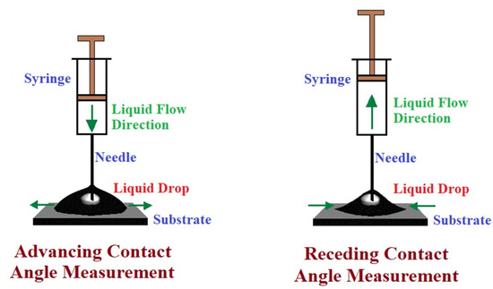 On the other hand, the “advancing contact angle”, θa, and “receding contact angle”, θr, values are also measured and reported in many articles to express the effect of the actual surface roughness and chemical heterogeneity of the substrates [1,2,3,6,8]. θa indicates the contact angle when the volume of the droplet is expanded through a syringe (or a dispenser) and the three-phase contact line is advanced on a fresh substrate. A maximum value of θa is determined before the three-phase line is ruptured or jumped outwards, as seen in Figure 2.