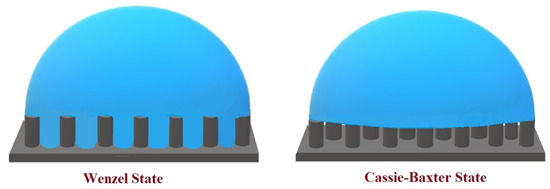 Without considering the conceptual differences between surface tension and surface free energy, Wenzel [26,27] and later Cassie [28,29] derived surface free energy-based contact angle equations, depending on the magnitude of the liquid/solid contact area below the droplet. These models are schematically described in Figure 3.