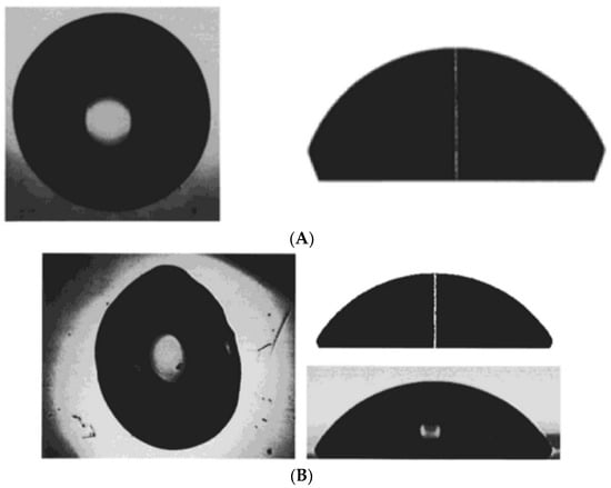 (A) Plan and side views and initial contact angle for a water drop on MYLAR (polyester) surface. (B) Plan and side views and contact angle for the same water drop during evaporation from the same MYLAR surface. The distortions of the drop perimeter can be clearly seen. (Reproduced with permission from [4], copyright 2001, American Chemical Society.).