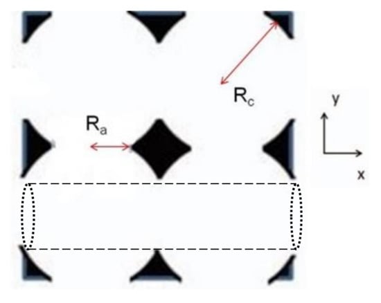 where h = 1/(1 − (Ra/Rc)2) [26]. In this study, the values of h and β are 1.04 and 0.56, respectively. As shown in Figure 1, the cavity array contains cylindrical channels of radius Ra connecting apertures, which are oriented parallel to the x, y, and z axes. In the absence of Brownian motion, the chains can be driven along such a channel without encountering the solid mass [26]. The effect of external force magnitude upon the localization of the polymers within these channels will be discussed in the next section.