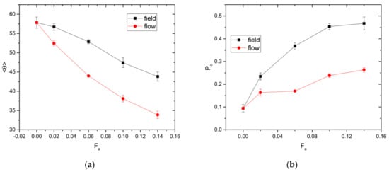 Values of (a) <θ> and (b) Pc for field and flow cases.