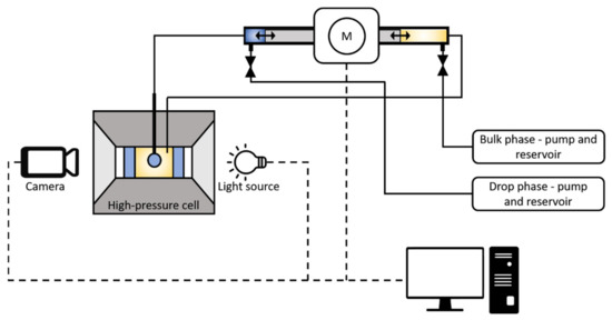 Air was displaced from the cell by CO2. Once the cell was filled with CO2, aqueous phase was injected through the needle, creating a pool of this phase at the bottom of the cell. Consecutively, the cell was pressurized with CO2 and heated to the desired conditions. Once the system reached thermal equilibrium, a few drops (4 or 5) were formed and allowed to detach from the needle tip to discard impurities. Then, a new drop was formed, and the measurement started.
