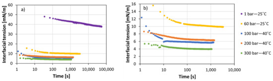 Dynamic interfacial tension (IFT) for 100 ppm (8.87 × 10−5 M) Brij L23 in synthetic seawater (SSW) droplet in CO2 at different conditions for (a) all conditions measured and (b) only pressurized systems.