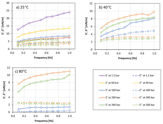 Elastic modulus (E′) and viscous modulus (E″) at temperatures from 25 to 80 °C for pressures of (a) 100 bar, (b) 200 bar and (c) 300 bar.