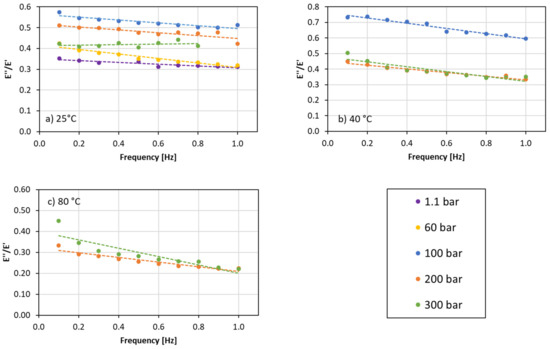 E″/E′ ratio for systems from 1.1 to 300 bar at temperatures of (a) 25 °C, (b) 40 °C and (c) 80 °C.