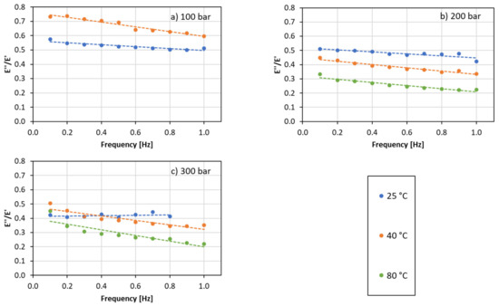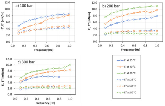 Figure 5 presents the same data presented above but in terms of E′ and E″ versus frequency of oscillation for 100 bar (a), 200 bar (b) and 300 bar (c).