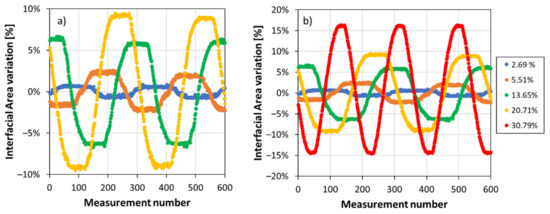 Effect of the motor backlash as a function of the interfacial area amplitude. (a) Interfacial area for variations of 2.69%, 5.51%, 13.65% and 20.71% of the average interfacial area (18 mm2), and (b) same data including an interfacial area variation of 30.79% (average IA = 38 mm2).