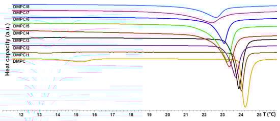 - Sturtevant, J.M. A scanning calorimetric study of small molecule-lipid bilayer mixtures. Prot. Natl. Acad. Sci. USA 1982, 79, 3963–3967. [Google Scholar] [CrossRef]
