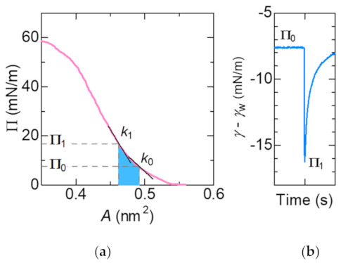 (a) Π –A isotherm of DSPC monolayers on the aqueous subphase at 25 °C [15]. The elasticity k0 and k1 is calculated directly from the slope at Π0 and Π1, respectively. The elastic energy stored in the lipid monolayer corresponds to the area denoted in blue; (b) Oscillation of surface tension. See the definition of Π0 and Π1.