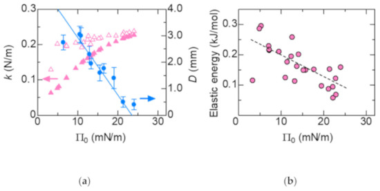 (a) Pink: Dependence of the elasticity k on Π0. Closed and open triangles represent data for k0 and k1, respectively. Blue: Dependence of the maximum displacement of the tracer particle D on Π0. The solid lines are estimated from the Π–A curve (Figure 2a); (b) Dependence of the elastic energy on Π0. The dashed line is a guide to the eye.