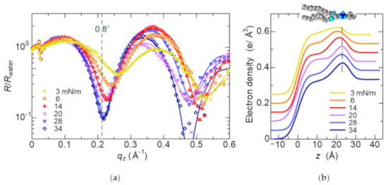 Figure 5 shows X-ray reflectivity curves for the DSPC surfactant monolayer formed with different surface pressures. They are divided by the X-ray reflectivity for water. The Kiessig fringes caused by the interference of X-ray beams reflected by the surfaces of the monolayer and water were observed. Density profiles along the direction normal to the water surface obtained by fitting are shown in Figure 5b. The peaks originated from the phosphor group penetrated in water is denoted by the dashed line in Figure 5b. The DSPC molecules in the monolayer become regularly oriented normal to the surface at higher surface pressure.
