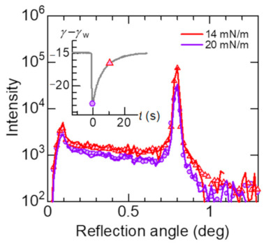 Reflection profiles at α = 0.8° monitored under the Marangoni flow compared to the profiles without Marangoni flow. The corresponding spontaneous oscillation of surface tension is shown in the inset. The reflection profile at the minimum surface tension (the purple circles) is similar to the profile at the static surface pressure of 20 mN/m (the purple curve), while the profile at which the recovering surface tension (the red triangles) is similar to the profile at the surface pressure of 14 mN/m (the red curve).