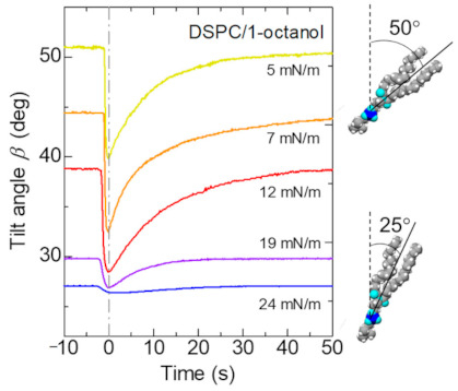 Figure 7 shows the tilt angle β of the chains from the surface normal estimated by the thickness of the layer describing the lipid chain region using Equation (6). The tilt angle becomes almost constant above 20 mN/m, in which the spontaneous oscillation of surface tension does not occur.