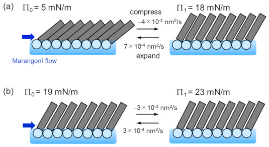 Dependence of the tilt angle on Π0 is shown in Figure 9a. The closed circles represent data for the initial Π0, whereas the open circles represent data for the compressed Π1 (see Figure 2 for the definition of Π0 and Π1). Figure 9b shows the dependence of the molecular area A on Π0. The closed and open circles represent data for the initial area A0 and the compressed A1, respectively. They are derived from the Π-A curve as shown in Figure 2. The horizontal dashed line shows the minimum molecular area at low temperature [20]. As the surface pressure increases, the molecular area decreases, so that the molecules stand in the direction perpendicular to the surface (Figure 9a). The change in tilt angle due to compression by Marangoni convection decreases as the surface pressure increases. However, it is hardly to change at Π0 > 20 mN/m, in which the DSPC molecules are close to the close-packed structure. Considering with that the lateral pressure for phospholipid bilayers was estimated in the region of 30–35 mN/m [21], there is not enough space for phospholipid molecules in biological membranes to freely translate. The schematic illustration of the behavior of DSPC molecules during the spontaneous oscillation of surface tension is shown in Figure 10. The length and tilt angle of the hydrophobic tail, the size of the hydrophilic head and the molecular area are drawn based on the present results. Comparing Figure 10a with Figure 9, at Π0 = 5 mN/m, the molecular area is reduced by only 10%, even though the tilt angle of the molecule is reduced by 20 degrees. Therefore, the molecules can be regarded as rotating rather than translating. While for the case in Figure 10b, the movement of the molecules are very small. In biological membranes, it is known that an additive increases the molecular area [21] and consequently induces a lubrication flow [4]. The rate of compression and expansion are estimated from the oscillation of the surface tension. Since the elasticity of DSPC monolayer becomes higher, the rate of compression decreases with increasing Π0. On the other hand, the rate of expansion is 10 times smaller than that of compression. From the elasticity, it is predicted that the higher the surface pressure, the faster the expansion speed. It seems that this was not the case because the solvation rate of 1-octanol spread on the water surface was lower at higher surface pressures [12].