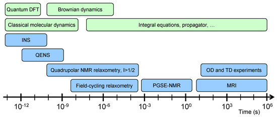 Schematic view of the time-scales probed by the various experimental methods (blue) and the numerical modeling (green).