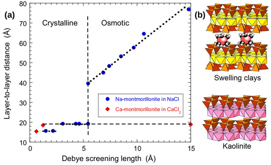 Furthermore, as illustrated in Figure 2, the use of swelling clays, such as Na+-saturated montmorillonite, allows probing a broad range of interlayer separations [4] varying between a limited number of hydration layers for layer-to-layer distances smaller than 20 Å, in the so-called crystalline swelling regime [2,56,57], and a large continuum of layer-to-layer distances (between 40 Å and 70 Å), in the so-called osmotic swelling regime. By contrast, Ca2+-saturated montmorillonite only exhibits crystalline swelling (see Figure 2) because inter-ionic correlation forces strongly reduce the swelling pressure of these charged interfaces [58,59]. For that reason, these dynamical experiments require the use of purified clay samples to avoid coexistence of swollen and unswollen phases within heterogeneous samples.