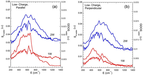 where is the instantaneous velocity of atom j. Before comparing the predictions obtained from the ab initio MD simulations with experimental data, the contributions from the dry clay network is subtracted [18]. The resulting spectra are displayed in Figure 3 for two hydration states corresponding, respectively, to the formation of one and two hydration layers [70]. In both longitudinal and perpendicular directions, the agreements between predicted and experimental spectra are semi-quantitative with a fair matching of the characteristic frequencies (see Figure 3), partially validating the use of the above-mentioned approximation in the treatment of such local motions of the confined water molecules.