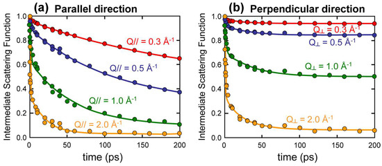 Time evolution of the Intermediate Scattering Function, in Equation (3), evaluated by numerical simulations of Molecular Dynamics for hydrated samples of saponite neutralized by Na+ counterions, along the directions parallel (a) and perpendicular (b) to the clay layers. Reprinted with permission from Ref. [28]. Copyright (2012) American Chemical Society.