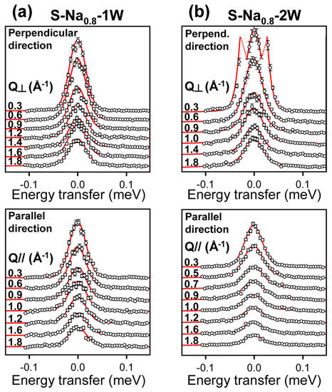 Comparison between the experimental and simulated , see Equation (2), for INS spectra of hydrated saponite sediments along the directions parallel (a) and perpendicular (b) to the clay layers (see text). Reprinted with permission from Ref. [18]. Copyright (2017) American Chemical Society.