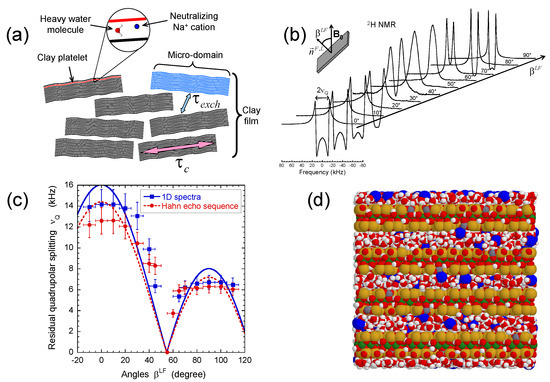(a) Schematic view of the multi-scale organization of the hydrated clay-sediment induced by the coexistence of various micro-domains resulting from the stacking of hydrated clay platelets; (b) variation of the 2H NMR spectra of the confined water molecules as a function of the sediment orientation in the static magnetic field; (c) variation of the residual quadrupolar splitting (see Equation (5)), extracted from the spectra displayed in Figure 6b; (d) snapshot illustrating one equilibrium configuration obtained by Grand Canonical Monte Carlo simulations of the water molecules and neutralizing Na+ counterions confined between fragments of saponite platelets. Reprinted with permission from Ref. [80]. Copyright (2014) American Chemical Society.