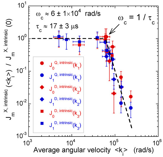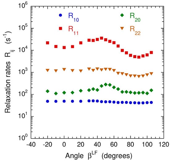 As illustrated in Figure 12, a broad range of angular velocities is then investigated by using a limited number of angular velocities. Figure 12 also exhibits the dispersion curve of the NMR relaxation rates. Here, we also detect a transition between a low-frequency plateau and a high-frequency continuous decrease.