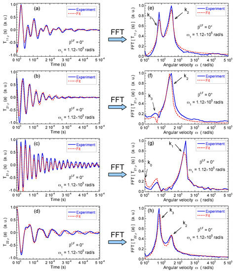 Time evolution of (a) ; (b) ; (c) and (d) coherences measured under spin-locking conditions, noted , , and , respectively, and their Fourier transforms for (e) ; (f) ; (g) and (h) coherences (2H NMR). These Fourier transforms better illustrate the contribution from the characteristic angular velocities ; see Equation (6). Reprinted with permission from Ref. [80]. Copyright (2014) American Chemical Society.