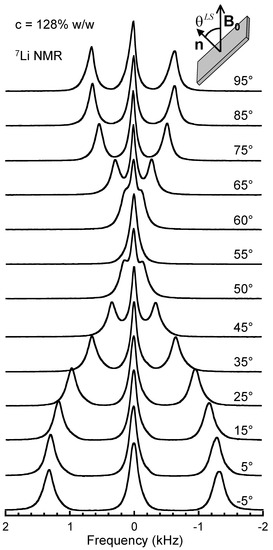 Variation of the 7Li NMR spectra measured within laponite aqueous dispersion as a function of the orientation of the clay sample in the static magnetic field. Reprinted with permission from Ref. [10]. Copyright (2008) American Chemical Society.