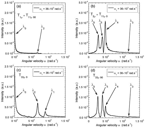 Fourier transform of the time evolution of the 7Li coherences, (a) ; (b) ; (c) and (d) , under spin-locking conditions, illustrating the whole set of characteristic angular velocities ; see Equation (7). Reprinted with permission from Ref. [41]. Copyright (2009) American Chemical Society.
