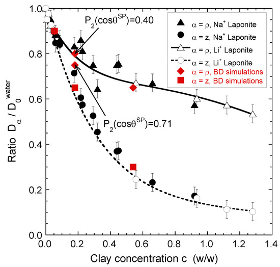 Influence of the clay concentration on the water self-diffusion tensor measured within laponite aqueous dispersion by using 1H NMR Pulsed-Gradient Spin-Echo attenuation. Reprinted with permission from Ref. [50]. Copyright (2008) American Chemical Society.