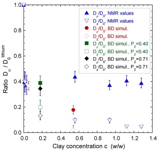 Influence of the clay concentration on the lithium ions self-diffusion tensor measured within laponite aqueous dispersion by using 7Li NMR Pulsed-Gradient Spin-Echo attenuation. Reprinted with permission from Ref. [50]. Copyright (2008) American Chemical Society.