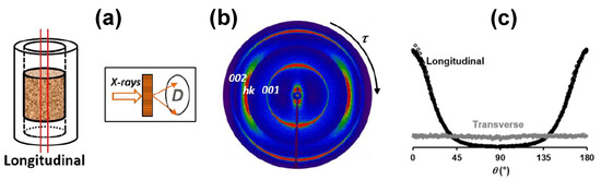 Determination of the orientation distribution functions of kaolinite particles within centrifuged clay samples by using 2D X-Ray Scattering patterns analysis. The longitudinal direction corresponds to the compression axis of the clay sample. (a) Schematic view of the experimental setup; (b) experimental 2D-XRS patterns and (c) orientation distribution functions (ODF) from the angular scan of the 001 reflection extracted from the 2D-XRS patterns. Reprinted from Ref. [52]. Copyright (2020), with permission from Elsevier.