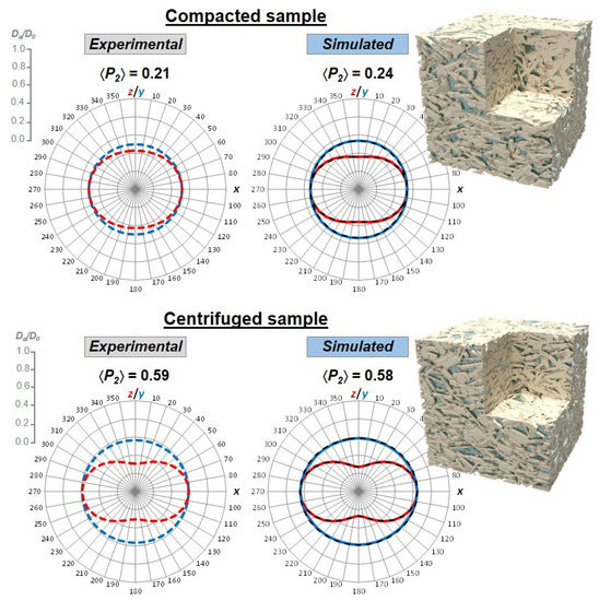 Influence of the preferred orientation of particles on the water self-diffusion tensor measured (red) and simulated (blue) within a collection of clay samples with the same porosity. The z-direction is perpendicular to the preferred alignment of clay platelets. Reprinted from Ref. [52]. Copyright (2020), with permission from Elsevier.
